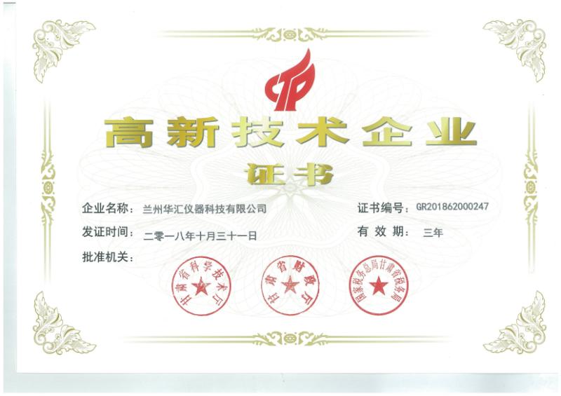 經(jīng)國家科技部、財政部、國家稅務(wù)總局專家評審,蘭州華匯儀器科技有限公司通過高新技術(shù)企業(yè)認證,獲得國家頒發(fā)的《高新技術(shù)企業(yè)證書》。
